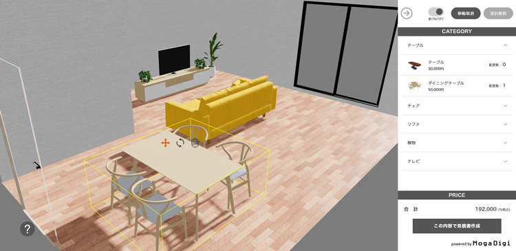 空間に商品を配置、移動、回転してシミュレーション 予め設定しておいた3D空間に、家具、雑貨などのオブジェクトを設置したり、移動、回転、削除することが可能です。屋内のインテリア、店舗の什器、工場の設備の配置などのシミュレーションを行うことが可能です。空間、オブジェクトは、ご要望に応じて追加、変更することも可能。シミュレーション空間は、Webで全画面表示することや、お客様のWebサイトの一部に埋め込むこともできます。 demonstrationデモンストレーション 備考 コンテンツとUIはご要望に沿って制作 備考 コンテンツとUIはご要望に沿って制作 備考 コンテンツとUIはご要望に沿って制作