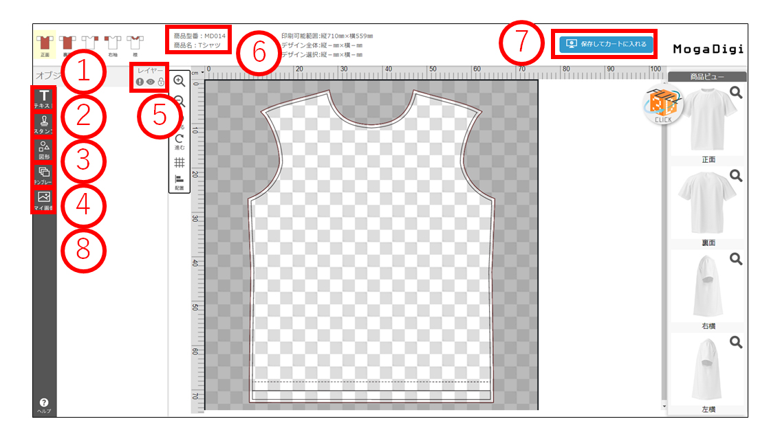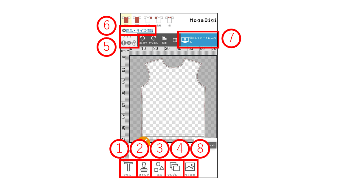 ①テキストツール ②スタンプツール ③図形ツール ④テンプレート ⑤レイヤーツール ⑥商品変更 ⑦デザイン保存 ⑧マイ画像