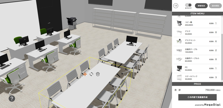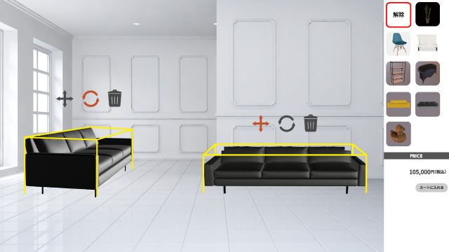 空間に商品を配置、移動、回転してシミュレーション 予め設定しておいた3D空間に、家具、雑貨などのオブジェクトを設置したり、移動、回転、削除することが可能です。屋内のインテリア、店舗の什器、工場の設備の配置などのシミュレーションを行うことが可能です。空間、オブジェクトは、ご要望に応じて追加、変更することも可能。シミュレーション空間は、Webで全画面表示することや、お客様のWebサイトの一部に埋め込むこともできます。 demonstrationデモンストレーション 備考 コンテンツとUIはご要望に沿って制作 備考 コンテンツとUIはご要望に沿って制作 備考 コンテンツとUIはご要望に沿って制作