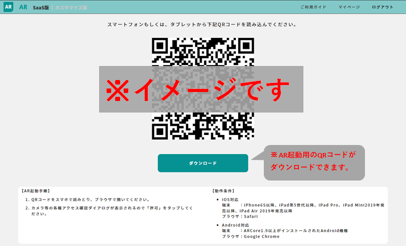 起動QRコード発行とは、アイテムごとのAR起動QRコードを、自動生成する機能となります(マイページより発行いただけます。画像参照)。